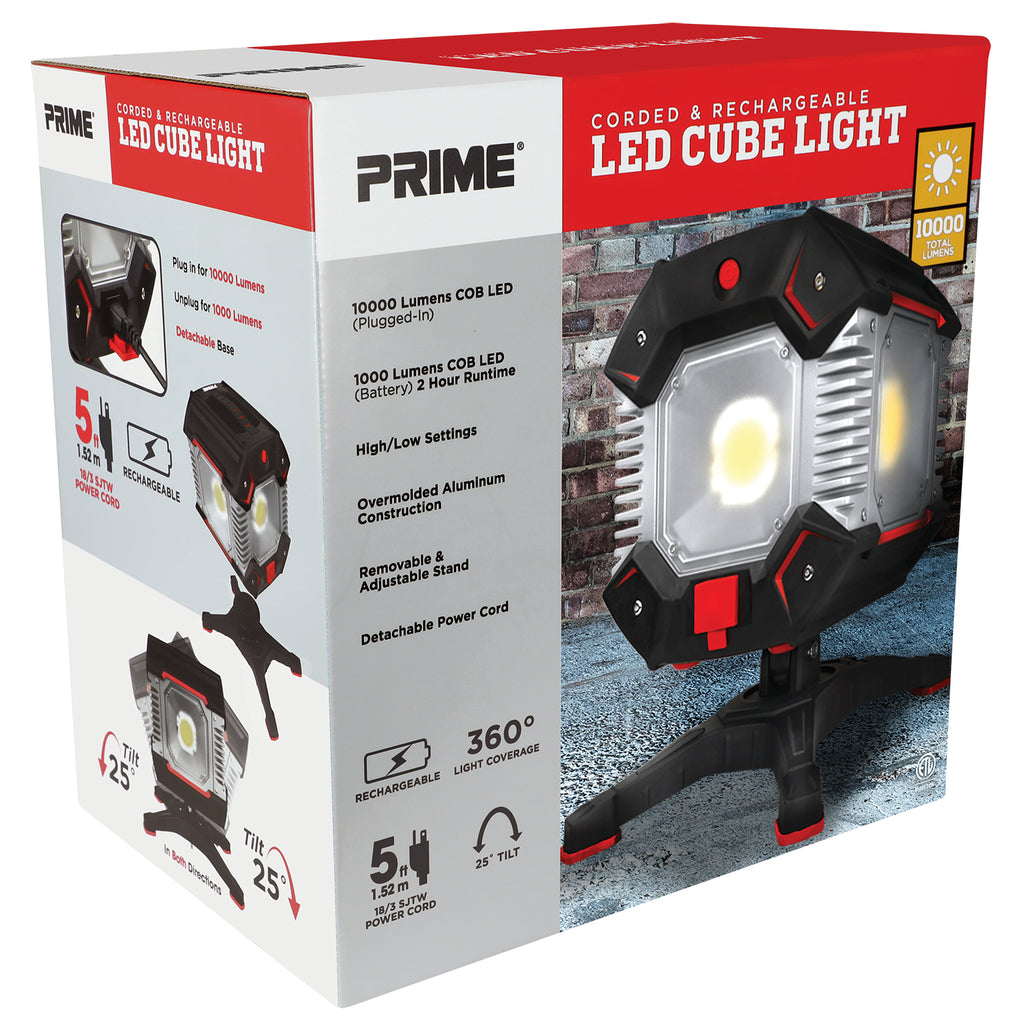 Prime’s LED Cube Light is designed for 360˚ light coverage and ultimate illumination and durability. With its powerful 10000 Lumens COB LED when plugged in and 1000 Lumens on battery power, this hybrid light helps ensure excellent visibility. Its overmolded aluminum construction is engineered to withstand the rigors of work sites or outdoor activities. Our LED Cube Light features an easily removable and adjustable stand, allowing for flexible positioning. Additionally, a threaded bolt is included for an optional tripod setup.